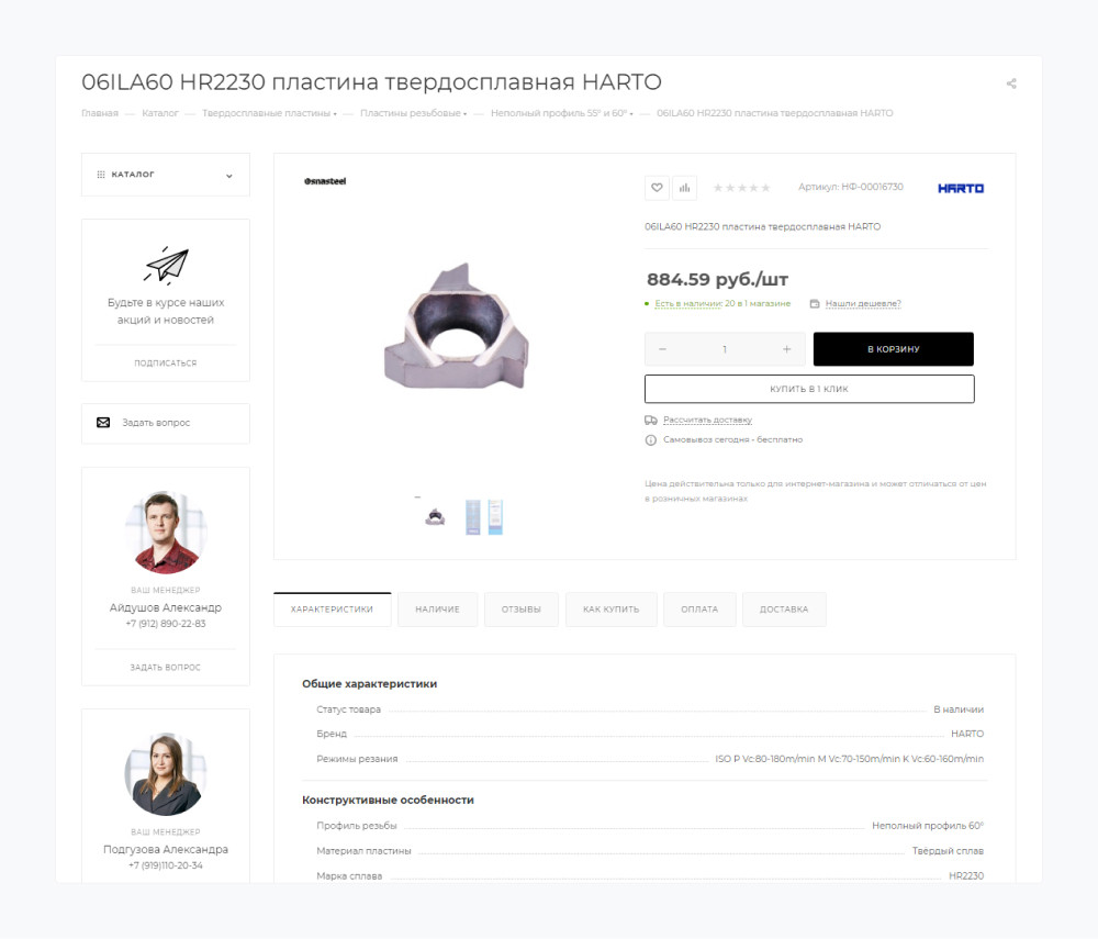 Боковая навигационная панель обеспечивает быстрый доступ к основным разделам ассортимента, позволяя пользователям мгновенно находить нужные категории оборудования. При работе с ассортиментом свыше 10 000 позиций критически важна удобная система поиска. Каталог представлен в удобном формате, что позволяет сравнивать технические параметры разных моделей. Интеллектуальная система фильтрации помогает быстро находить оборудование по ключевым критериям — материалу изготовления, габаритам, ценовому диапазону. Карточки продуктов структурированы с учетом потребностей технических специалистов. Характеристики разделены на логические группы: Встроенный инструмент группировки свойств в решении обеспечивает наглядное представление сложной технической информации. Партнеры реализовали синхронизацию магазина с корпоративной учетной системой. Настроена двусторонняя передача данных в режиме реального времени. Подготовительный этап потребовал значительных усилий по систематизации номенклатуры, стандартизации характеристик и загрузке визуального контента. Результаты автоматизации: По словам Анастасии Ефремовой: «Наши клиенты начали формировать счета прямо на сайте. Это очень облегчило работу. Мы каждый день добавляем новые товары и делаем сайт более информативным. При работе над проектом самое сложное было не отчаиваться, а довести дело до конца. Испытываю бесконечную радость и гордость, что запустились и все работает, а также огромную благодарность ко всем участников проекта!» Запуск интернет-магазина стал первым этапом цифровой трансформации бизнеса. В планах компании: SEO-оптимизация: Работа по поисковому продвижению уже началась для увеличения органического трафика и привлечения новых клиентов. Контекстная реклама: Подготавливается рекламная кампания для быстрого выхода на целевую аудиторию. Этот кейс демонстрирует, как правильная техническая платформа и грамотная автоматизация помогают B2B-компаниям масштабировать бизнес и повышать эффективность обслуживания клиентов. Запуск сайта за 3 месяца — это быстро и экономично. Мы установим решение Аспро, наполним каталог товарами, добавим информационные страницы и подключим интеграцию с системами приема платежей, доставки и 1С.