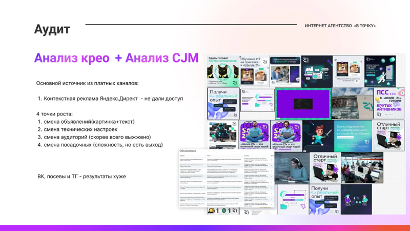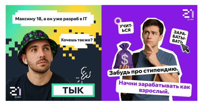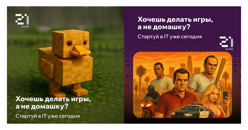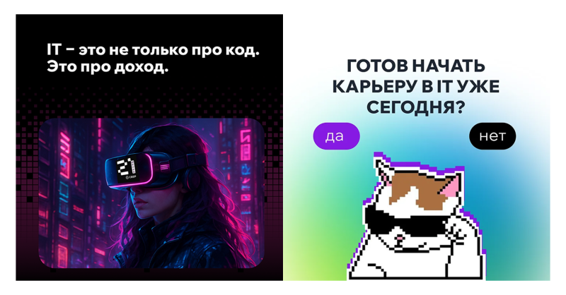 В-третьих Мы сформировали целевую точку B — стратегию, в которой мы не просто поднимаем CTR и меняем баннеры, а усиливаем каждый шаг: от показа объявления до прихода на отборочный тур. Так у нас появилось три крупных блока роста: повышение CTR, рост конверсии в регистрацию и рост конверсии из регистрации в запись на обучение. Шаг 1 Шаг 2 Шаг 3 Креативы, на которые кликают: от пиксельной уточки до лиц студентов Когда мы добрались до креативов, сразу задались вопросом: «Что сделает объявление максимально узнаваемым и своим для человека по ту сторону экрана?» Первая гипотеза — гео Мы предложили использовать реальные виды городов, кампусы и даже фасады университетов, в которых проходит обучение. На знакомые здания аккуратно «вшивали» фирменные элементы: пиксельную уточку, логотип школы, легкую пикселизацию памятников и площадей. По нашему опыту, такие геопривязанные креативы стабильно поднимают CTR на 25–30%, и здесь мы опирались как на проекты для других клиентов, так и на наш SMM‑опыт. Примеры креативов: Вторая гипотеза — лица. Мы сфокусировались на лицах студентов и выпускников, на живых фото с кампусов, кадрах с мероприятий, эмоциях на их лицах. В идеале — использовать реальные лица и даже запускать кампании, таргетированные на друзей и окружение этих студентов во ВК. В одном из наших кейсов подобная тактика давала клики дешевле, потому что люди видят в рекламе знакомых и кликают почти инстинктивно. Примеры креативов: Третья гипотеза — видео и динамика. Во ВКонтакте добавился вертикальный видеоформат, и мы предложили клиенту не снимать «глянцевую рекламу», а записать живые вертикальные ролики на обычный смартфон: быстрая нарезка кампуса, фрагменты игры, студенты, которые на ходу рассказывают, зачем им школа и что она изменила. Четвертая гипотеза — мемы и геймерские отсылки. Для школьников и части студентов мы использовали связки с Minecraft, GTA, пиксель‑артом, котиками, легким самоироничным юмором: «Хочешь делать игры, а не домашку?», «IT — это не только про код, это про доход». Такие креативы вызывали отклик и позволяли говорить с аудиторией на её языке. Примеры креативов: ВКонтакте, Telegram и контекст: перераспределяем роли каналов Разбирая каналы продвижения, мы увидели знакомую картину: около 80% заявок приходят из Яндекс Директа, а ВК и Telegram используются скорее по остаточному принципу. При этом именно ВК — наша сильная сторона: таргет, ручные посевы, работа с сообществами, лид‑формы. Примеры креативов: Сегментация аудитории: четыре жизненных сюжета Вместо абстрактного «портрета целевой аудитории» мы собрали четыре живых сегмента и начали думать о каждом как о герое собственной истории: 01 Школьники 02 Студенты 03 Те, кто хочет сменить профессию 04 Возрастная аудитория 35+ Сквозная тема для всех сегментов — деньги. Мы не обещаем «золотые горы», но показываем медианные зарплаты по городу и сравниваем их с привычными профессиями. Лидмагниты и профориентация: сначала польза, потом приглашение Мы понимали, что далеко не все готовы прямо сейчас сразу идти в основной «отборочный тур». Поэтому в стратегию встроили лидмагниты — небольшие, но реально полезные материалы, за которые человеку не стыдно отдать контакт. От клика до заявки: как мы усилили воронку на каждом шаге Воронка у школы была непростой: заявка, первая анкета, отборочная игра, просмотр