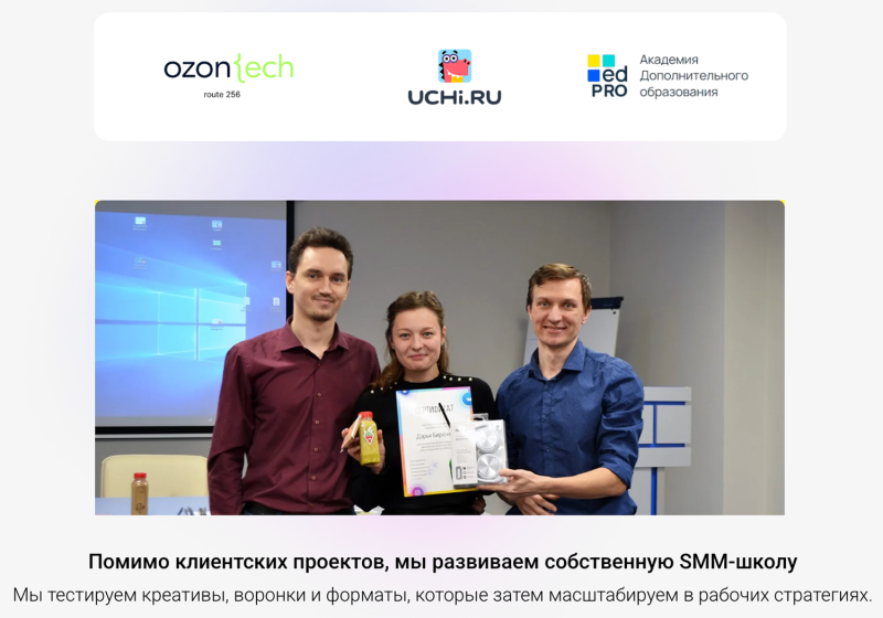За последние годы мы работали с крупными образовательными проектами: участвовали в развитии IT-направления Ozon Tech, запускали Route256, продвигали продукты uchi.ru и привлекали студентов для EdPro. Такой опыт дал нам глубокое понимание какие инструменты действительно приводят учеников.