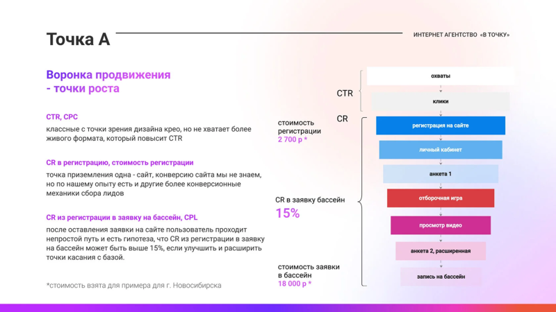 Доходимость до отборочного тура. С момента регистрации до реальной записи доходило около 15% пользователей. С учетом силы бренда и продукта мы видели реальную возможность поднять эту цифру хотя бы до 20–25% — за счет увеличения количества касаний, автоворонок и ретаргетинга.