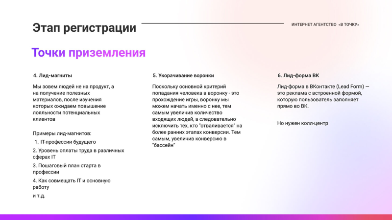 Если человек кликнул по рекламе, но не зарегистрировался — догоняли его объявлением с другой формулировкой или лидмагнитом. Если зарегистрировался, но не дошел до игры — напоминали об этом в боте или через ретаргет во ВК.Если посмотрел видео, но не записался на на отборочный интенсив — показывали истории тех, кто дошел до конца и прошел обучение.